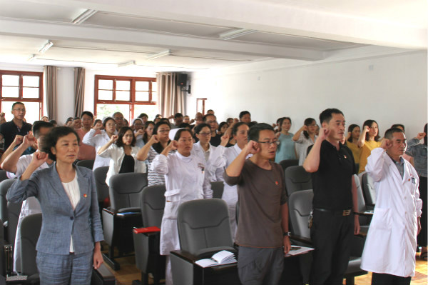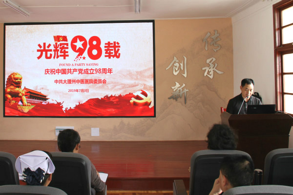 7月3日下午,大理州中医医院党委以庆祝建党98周年为契机,以习近平新时代中国特色社会主义思想和党的十九大精神为主要内容,组织开展了重温入党誓词、观看警示教育片及邀请州委党校教授讲党课等系列庆祝活动。医院党政领导班子及全体党员共100余人参加活动,活动由院党委书记石应聪主持。