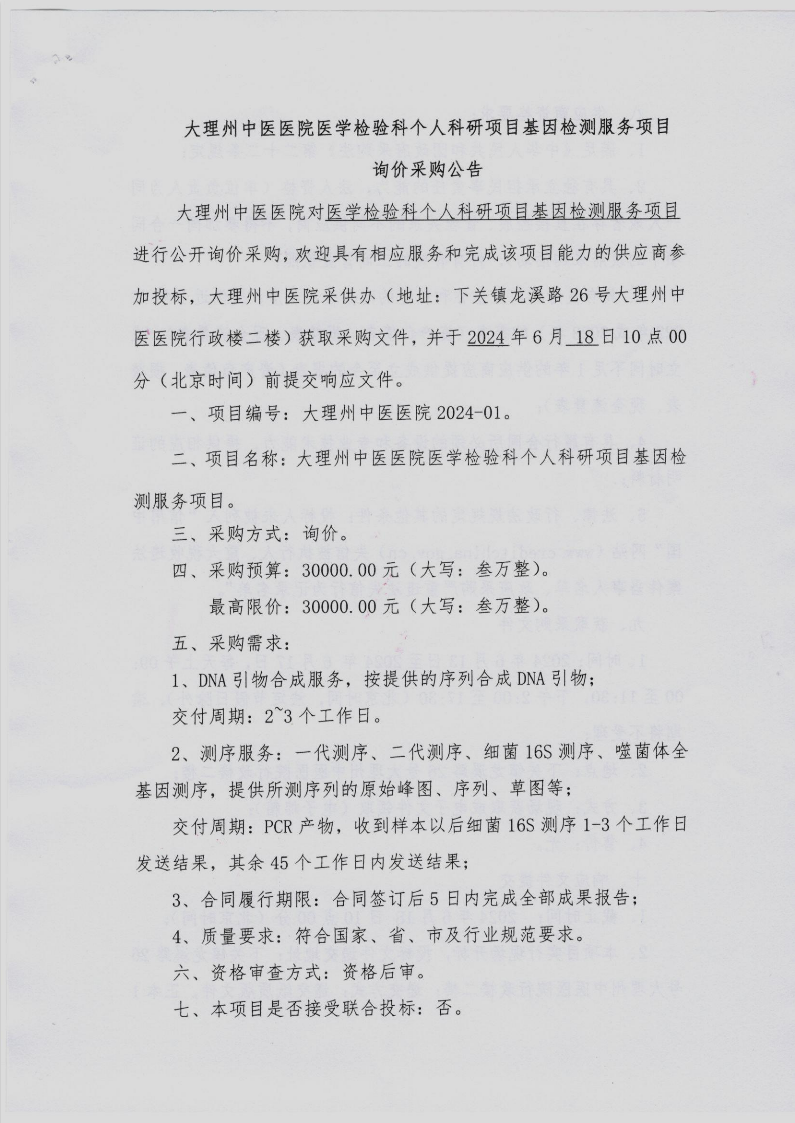大理州中医医院医学检验科个人科研项目基因检测服务项目询价采购公告